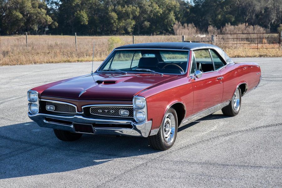 The roadster rides on polished American Racing Torq-Thrust II wheels, measuring 15×6-inch front and 15×10-inch rear, wrapped in Hoosier Pro Street tires. A purple cloth “Bop Top” convertible top completes the exterior presentation.